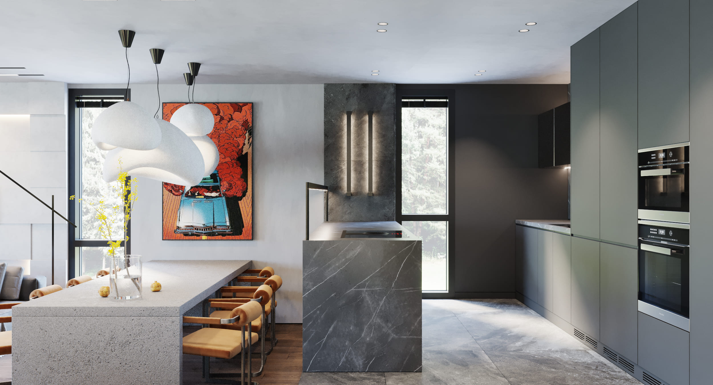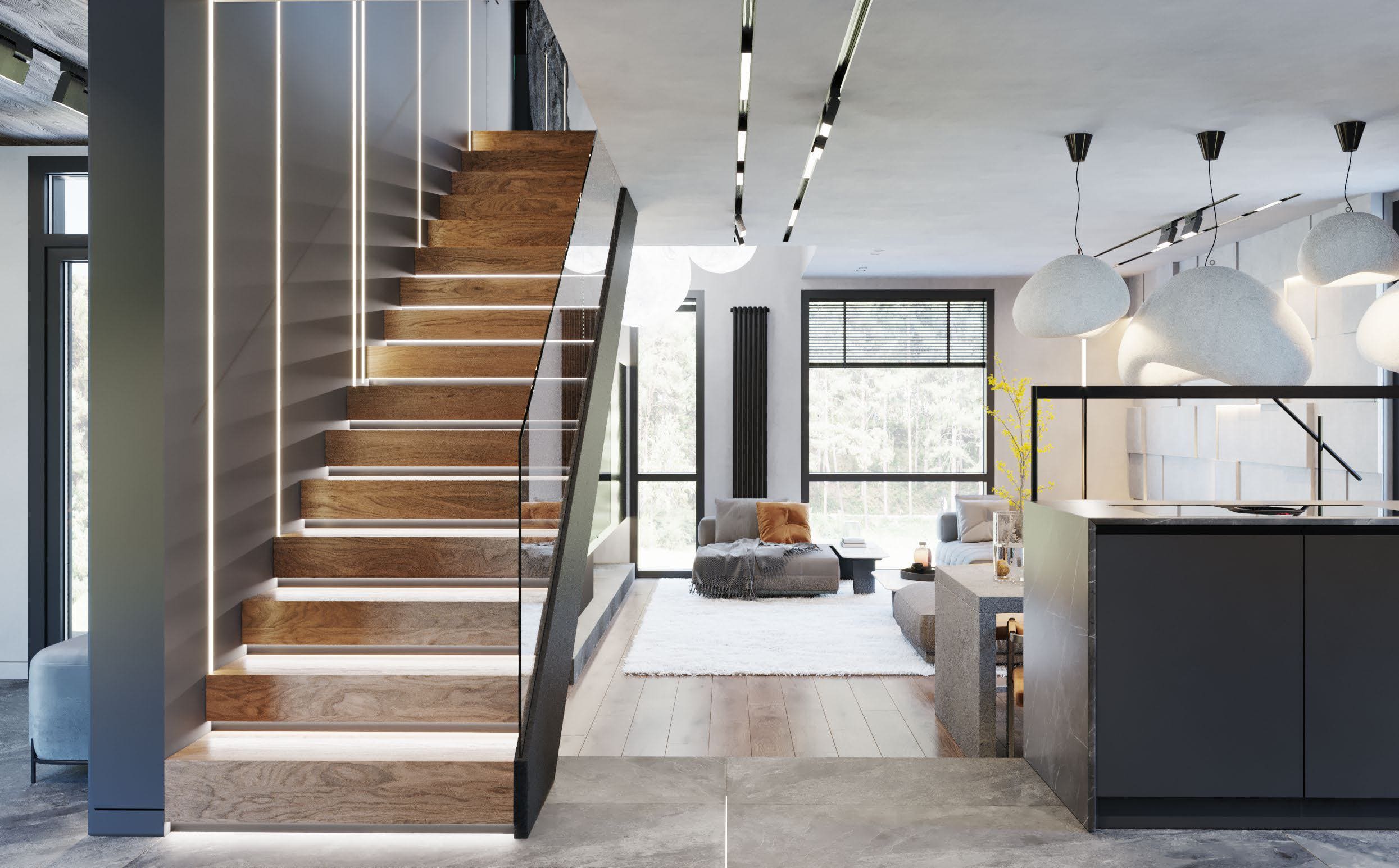Особенностью спальни клиента стали подвесные светильники в виде луны. Лестница, соединяющая первый и второй этажи, также служит не только функциональным элементом интерьера, но и важным эстетическим элементом. Она получилась парящей, имеет свое освещение, а также линии подсветки на стене.