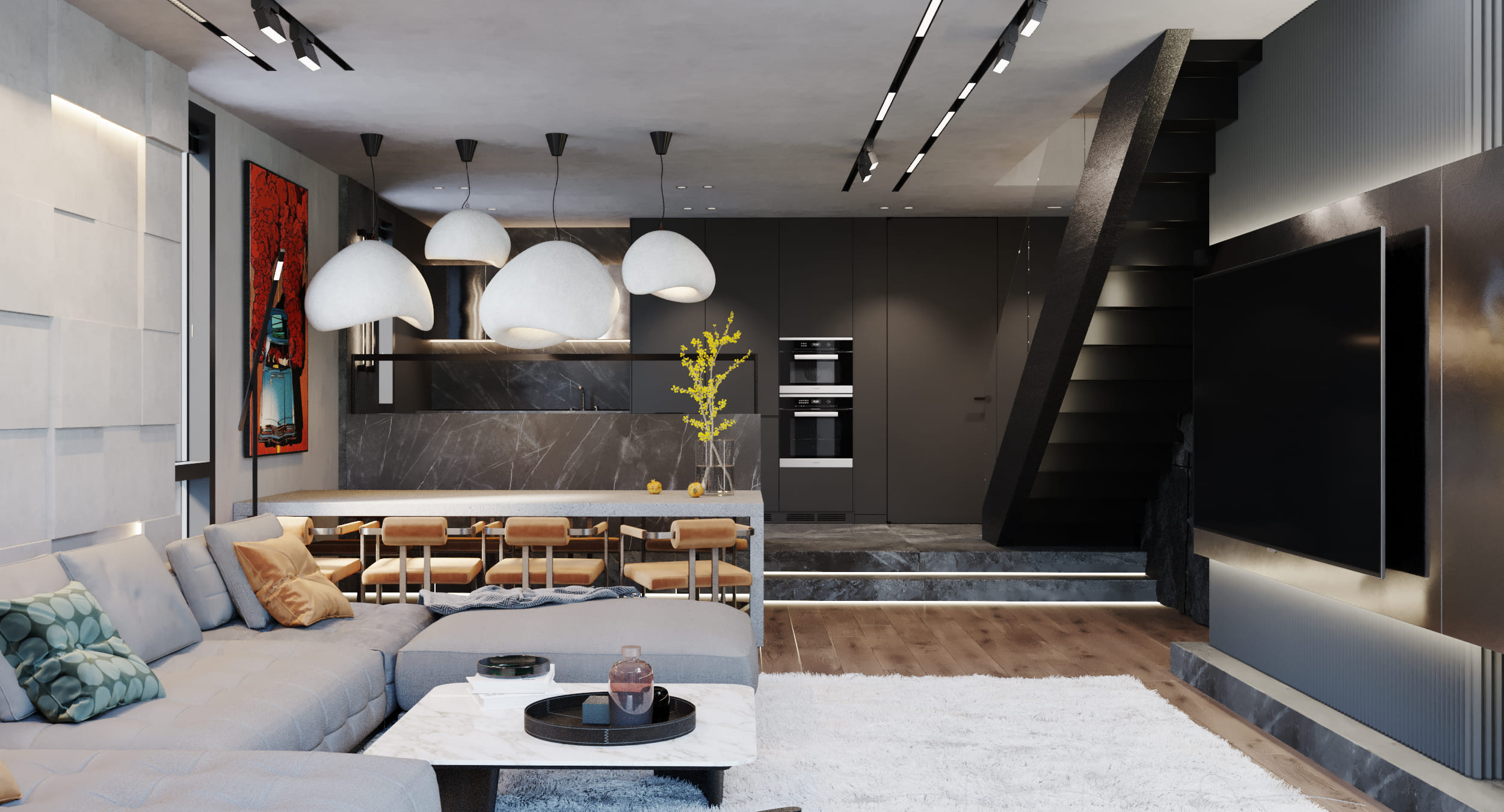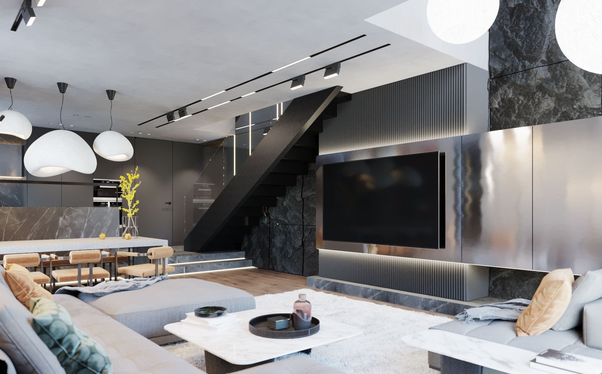 Проект для молодого человека, который любит последние тенденции. Пожелание: сделать современно и с эффектом «вау». Интерьер выполнен на контрасте. Задействованы как светлые, так и темные оттенки. Применили эко-освещение, гипсовые панели с подсветками, необычный декор, стену под камень.