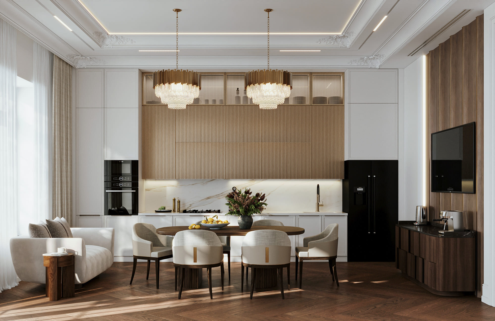 Интерьер выдержан в сдержанной цветовой гамме — белый, теплые древесные тона, золотые акценты, черные элементы техники и декора. Всё это создает ощущение дорогого, но уютного современного пространства, которое органично объединяет кухню, столовую и гостиную.