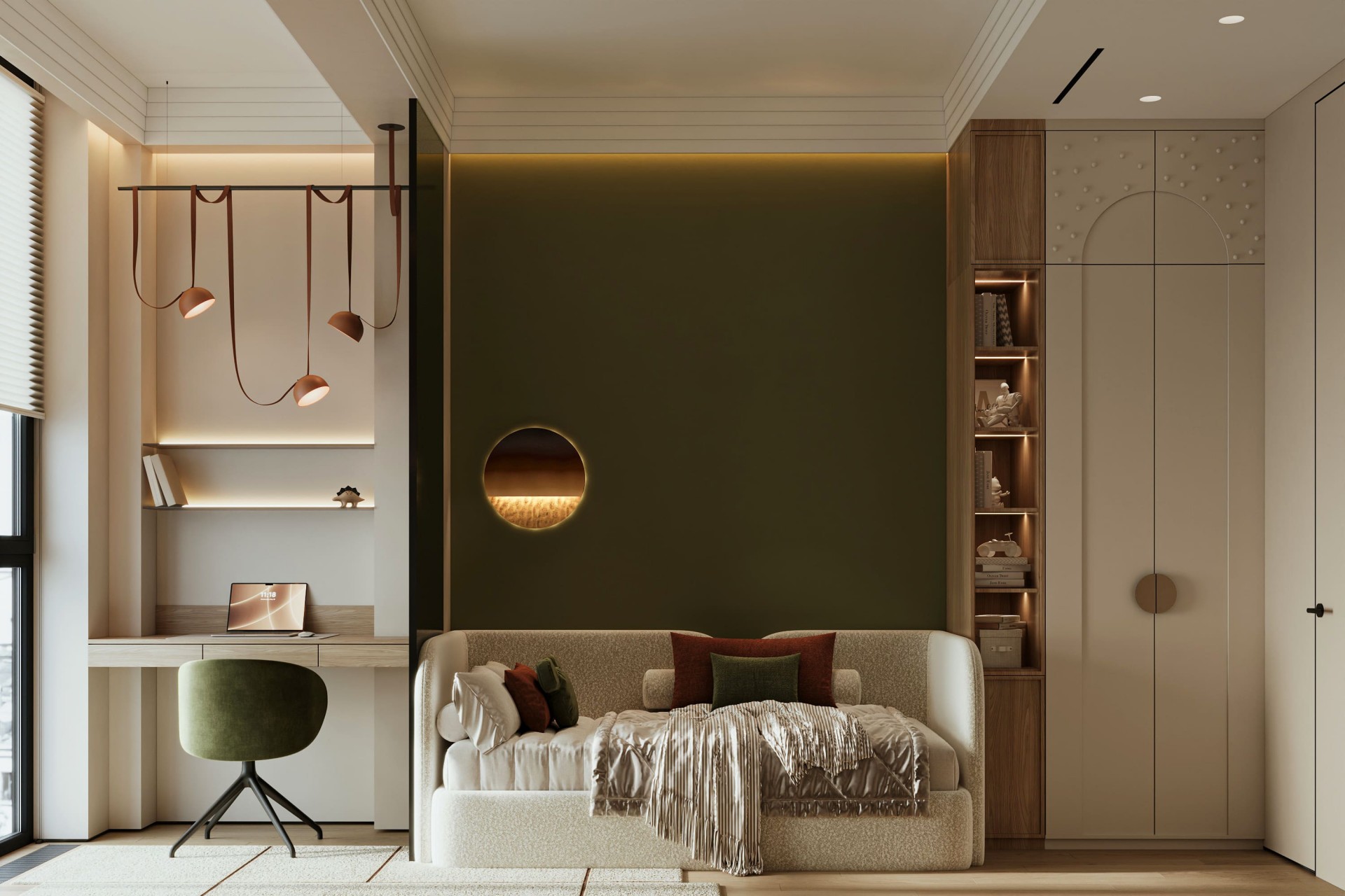 Детская комната выполнена в более современном ключе, она функциональная и универсальная. Нейтральная цветовая палитра подходит для любого пола ребёнка. Пространство разделено поровну: у каждого есть личная зона для учебы, игр и отдыха.