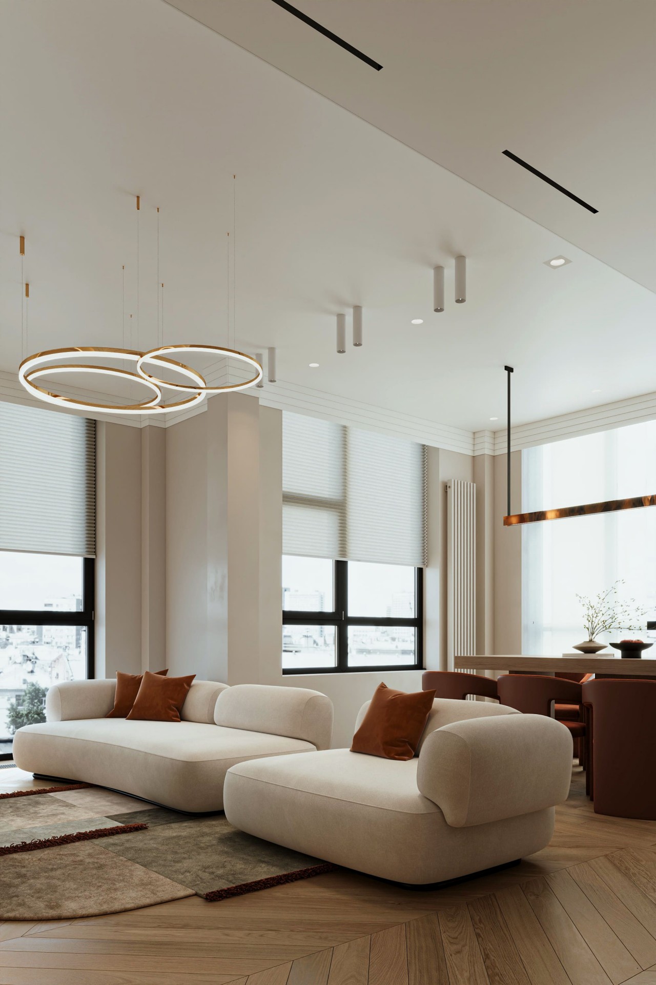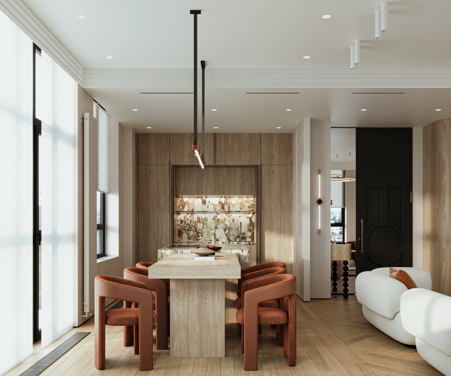 Главная концепция — современный дизайн с акцентами арт-деко, отражающими премиальную стилистику комплекса. В основе лежат натуральные материалы: инженерная доска, мебель из шпона, элементы кухни, выполненные из натурального камня. Плавные линии и мягкие формы создают ощущение комфорта: скруглённые углы стен и мебели подчеркивают гармонию пространства.